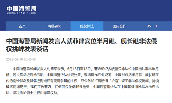中国海警局新闻发言人刘德军表示,6月15日至18日,菲方组织多艘船只非法位中国南沙群岛半月礁、舰长礁邻近海域活动,中国海警依法依规处置,现场操作专业规范。中国对包括半月礁、舰长礁在内的南沙群岛及其邻近海域拥有无可争辩的主权,菲公务船打着所谓“护渔”幌子非法侵权挑衅,持续破坏南海稳定。我们正告菲方,任何侵权伎俩都是徒劳。中国海警将依法在中国管辖海域常态维权执法,坚决维护领土主权和海洋权益。