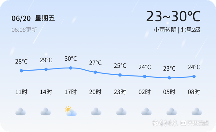 今天是6月20日,星期五,农历五月廿五。菏泽市今天天气为小雨转阴,气温在23℃至30℃之间,北风2级,空气湿度87%,PM2.5浓度为36,空气质量等级为优,适宜户外活动。由于今日有小雨天气,建议市民出行时携带雨具,注意道路湿滑,减速慢行,确保行车安全。