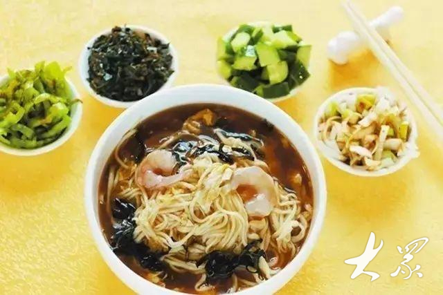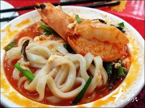 胶东大虾面:胶东半岛的特色面食,制作简单,味道鲜美,营养丰富。通常是用一只大虾、一碗鲜汤搭配一把面条组合而成,是胶东人喜爱的美食。