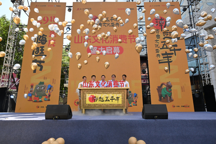 6月21日上午,本次山东文化消费节迎来巅峰时刻——“潮越五千年·齐鲁文化盛典”在济南银座商城店外广场璀璨启幕,盛典融合华服秀、古乐演奏、国潮音乐秀,并同步推出鲁博文创花车等沉浸式消费场景。