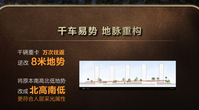 在施工工艺上,海信·君安对房屋质量和建造工艺秉持高标准、严要求。在产品设计阶段,为保证项目采光,动用千辆重卡逆改8米原生地势,将南高北低的地块抬升为北高南低的山势,为业主提供极致采光的居住体验。