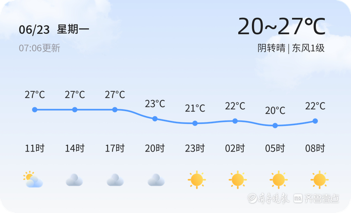 今日是6月23日,星期一,农历五月廿八。威海市天气阴转晴,温度在20℃至27℃之间,东风1级,空气湿度为39%,PM2.5浓度为37,空气质量良好。市民朋友们在享受阳光的同时,也请注意防晒,避免紫外线对皮肤的伤害。出行时建议携带雨具,以防天气突变。