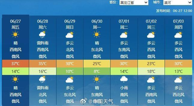 漠河27日的温度(图源:中国天气官方微博)中气爱团队认为东北地区5-6月的高温,往往是西风带暖脊影响所致。今年6月下旬影响东北的西风带暖脊强度很强,而且非常稳定,被其控制的东北地区受干热气团持续影响3-5天,地表热力长期积聚,因此这轮高温强度强、持续时间很长。