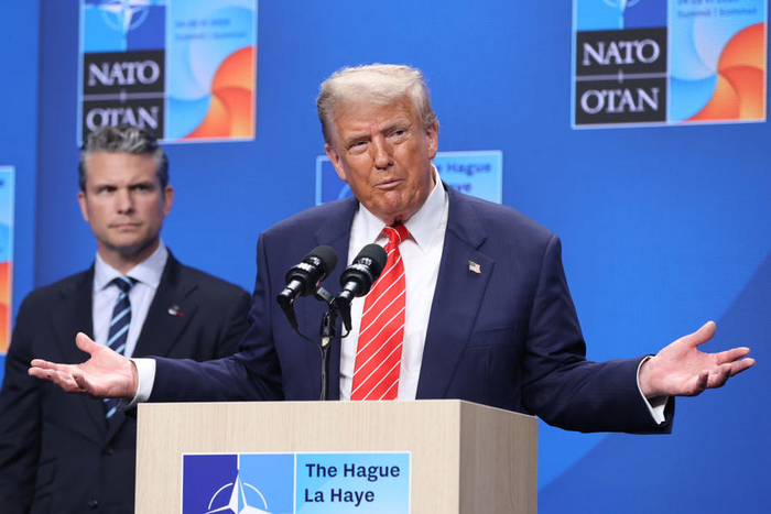 6月25日,在荷兰海牙,美国总统特朗普(前)在北约峰会后出席记者会。新华社西方国家一直怀疑伊朗秘密发展核武器,伊朗则坚称其核计划仅用于和平目的。