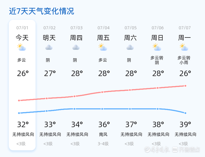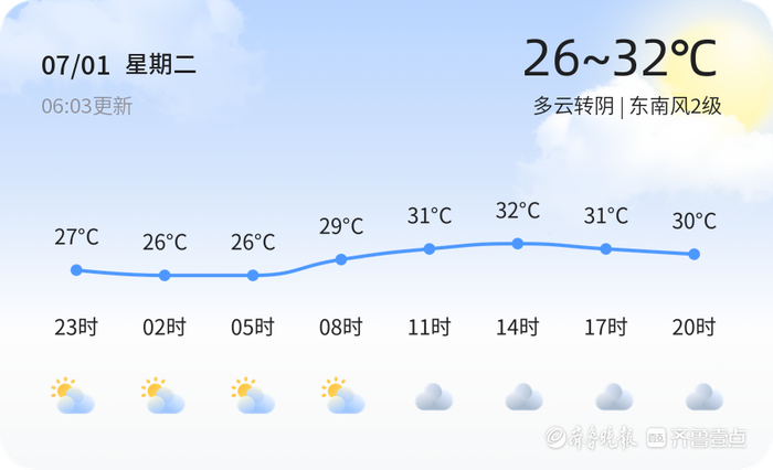今天是7月1日,星期二,农历六月初七。潍坊市今日天气多云转阴,白天气温在26℃至32℃之间,东南风2级,空气湿度较高,为90%。目前全市各区天气状况一致,均为多云转阴,市民出行时需注意防晒和携带雨具以防天气突变。