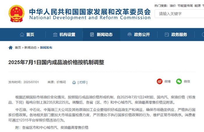 根据近期国际市场油价变化情况,按照现行成品油价格形成机制,自2025年7月1日24时起,国内汽、柴油价格(标准品,下同)每吨分别上涨235元和225元。调整后,各省(区、市)和中心城市汽、柴油最高零售价格见附表。