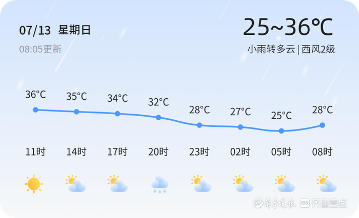 今天是2025年7月13日,星期日,农历六月十九。临沂市迎来小雨转多云的天气,最高气温达36℃,最低气温25℃,西风2级,空气湿度91%,PM2.5指数为49,空气质量良好。市民朋友们请注意防晒补水,出行时建议携带雨具,以备不时之需。
