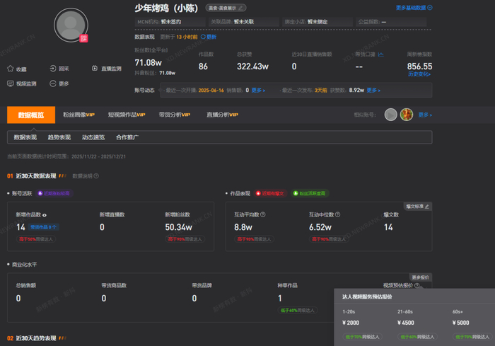 ▲小陈正在烤鸡第三方数据显示,“少年烤鸡(小陈)”近30日涨粉超50万。此外,其1-20s视频广告报价为2000元,21-60s视频广告报价为4500元,60s以上视频广告报价为5000元。
