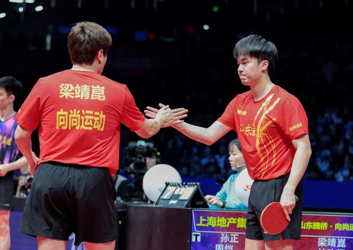 12月27日,山东魏桥·向尚运动队组合梁靖崑(前左)/林昀儒在双打比赛获胜后庆祝。新华社梁靖崑/林昀儒 3-0 薛飞/刘冠成【11-1,11-4,11-5】