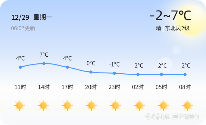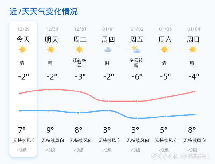 明天(12月30日),聊城市的天气将继续保持晴朗,气温较今日有所上升,预计最高气温为9°C,最低气温为-2°C,风力仍以无持续风向为主,风速小于3级。市民可以继续享受晴好天气带来的舒适体验。