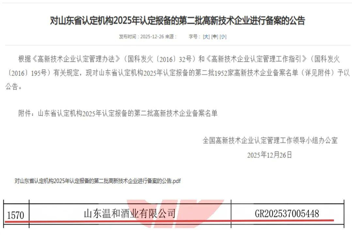山东温和酒业通过“国家高新技术企业”认定与科研新品的成功发布,展现了传统企业转型升级的清晰路径与发展自信。未来,温和酒业将继续坚持创新驱动、文化赋能、本土共赢的发展理念,推动鲁酒走向更广阔的市场,谱写中国白酒高质量发展的新篇章。