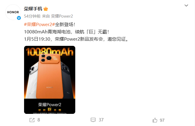 12 月 29 日消息,荣耀开启新一代荣耀Power2手机预热,宣布荣耀Power2手机将于1月5日发布,新机将搭载10080mAh的第四代青海湖电池。