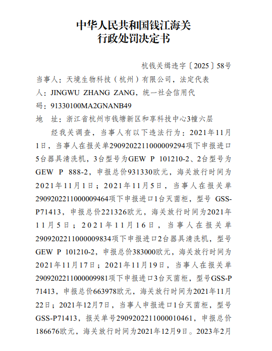 内容显示,经中华人民共和国钱江海关调查,天境生物有以下违法行为:2021年11月1日至2021年12月7日,当事人申报进口清洗机、灭菌柜等12台设备。2023年2月28日及3月3日,因符合《财政部海关总署税务总局关于“十四五”期间支持科技创新进口税收政策的通知》(财关税2021【23号】)的相关规定,当事人就上述进口的 12台设备获得钱江海关出具的5份《海关进出口货物征免税确认通知书》,编号为Z290012340488、Z29012340447、Z29012340490、Z29012340446、Z29012340489,申请退回了上述12台设备进口时已缴纳的关税。