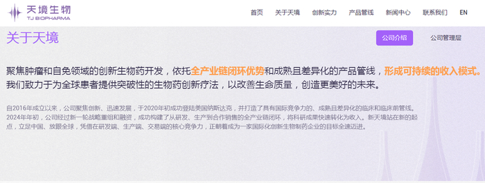 据天境生物官网介绍,公司是一家聚焦于自身免疫疾病、肿瘤免疫和代谢疾病领域创新疗法的全链条生物科技公司。公司立足中国,聚焦全球创新药的研发、临床试验、生物药生产以及产品上市和产品的合作商业化。公司已建成涵盖上海、北京研发中心和杭州GMP生产基地在内的产业链闭环,于2020年初成功登陆美国纳斯达克。
