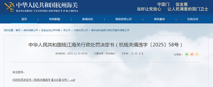 综上,依照《中华人民共和国海关行政处罚实施条例》第十八条第一款第一项、《中华人民共和国海关行政处罚裁量基准(一)》(海关总署公告2023年第182号)第十二条第一项之规定,决定对当事人天境生物科处罚款人民币2.88万元。处罚决定书文号:杭钱关缉违字〔2025〕58号。