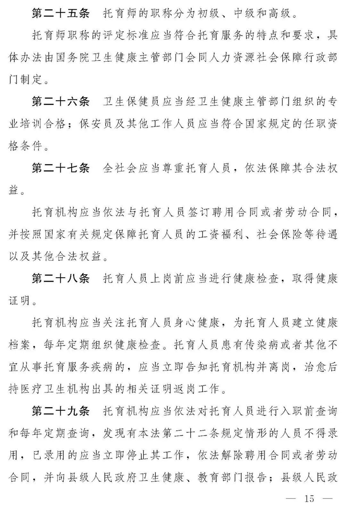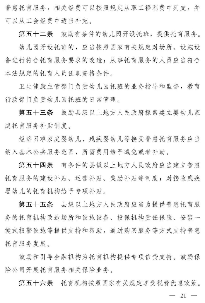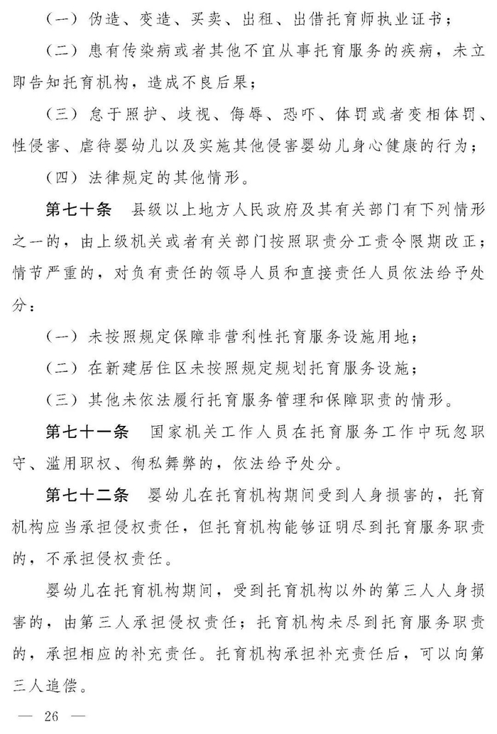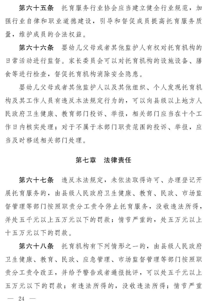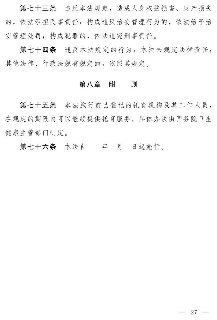 十四届全国人大常委会第十九次会议对《中华人民共和国托育服务法(草案)》进行了审议。现将《中华人民共和国托育服务法(草案)》公布,社会公众可以直接登录中国人大网(www.npc.gov.cn)或国家法律法规数据库(flk.npc.gov.cn)提出意见,也可以将意见寄送全国人大常委会法制工作委员会(北京市西城区前门西大街1号,邮编:100805。信封上请注明托育服务法草案征求意见)。