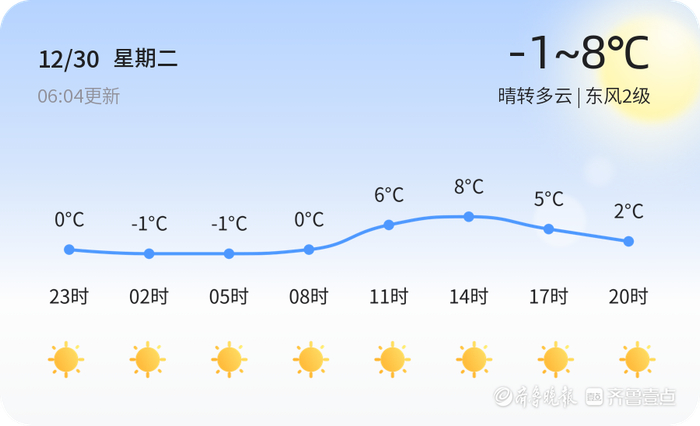 今天是12月30日,星期二,农历十一月十一。泰安市迎来晴转多云的天气,当前气温为-3.1℃,风向为东风2级,空气湿度为80%。PM2.5指数为93,属于良好级别,空气质量适宜户外活动。由于早晨气温较低,市民出行时需注意防寒保暖,建议穿厚实的冬装,佩戴围巾和手套,以应对寒冷天气。此外,早晨的低温可能导致路面结冰,驾驶车辆时请注意保持车距,减速慢行,确保行车安全。