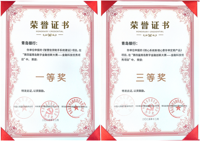 近日,第四届青岛数字金融创新大赛圆满落幕,青岛银行凭借卓越的金融科技创新能力,一举斩获两项重要奖项:《智慧信贷助手系统建设》项目荣获金融科技优秀项目一等奖,《核心系统新增心意存单定期产品》项目荣获金融科技优秀项目三等奖。这两项荣誉的获得,充分彰显了青岛银行在金融科技领域的创新实力和领先地位,也标志着青岛银行在数字化转型道路上迈出了坚实的步伐。