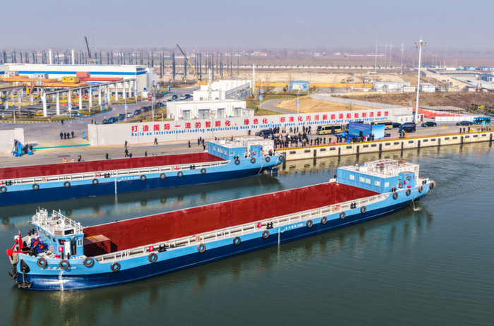 12月29日,在邹城的白马河畔,伴随着5艘67.6m纯电动多用途船的下水航行,济宁能源集团与宁德时代电船科技有限公司“50艘纯电动力船订单签约暨首批5艘多用途电船交付活动”顺利举行,山东首支规模化、成建制纯电动货船船队将在京杭运河上投入运营,“电化运河”场景化应用迈出实质一步。
