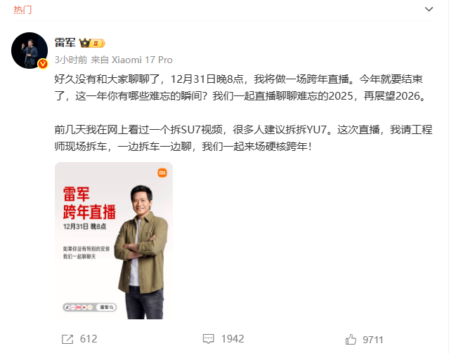 小米创办人、董事长兼CEO雷军宣布,将于12月31日晚8点做一场跨年直播。