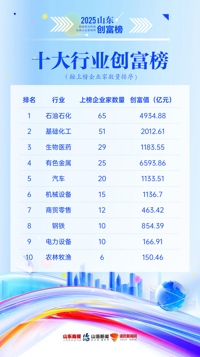 从财富创造值来看,有色金属行业以6593.86亿元位列首位,生物医药、机械设备、汽车三大行业则以千亿创富值位居山东创富行业第二梯队。
