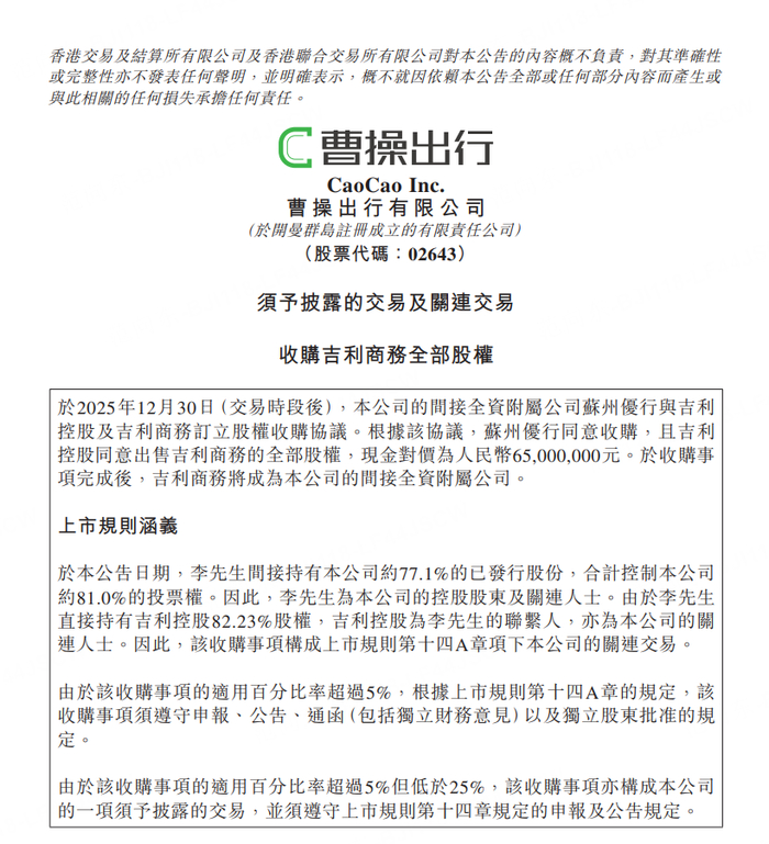 “收购耀出行和吉利商旅,是曹操出行构建‘一站式科技出行平台’的关键战略举措。”曹操出行CEO龚昕表示,“两项收购完成后,我们将打通从日常通勤、商务接待到差旅管理的全场景服务链条,融合耀出行的全球高端服务网络与吉利商旅的智能差旅解决方案,为各类客户提供无缝衔接、标准统一的品质出行体验。这不仅会强化我们在企业出行和商旅服务市场的竞争力,也将支持曹操出行在全球智慧出行领域创造更大价值,实现长远发展。”