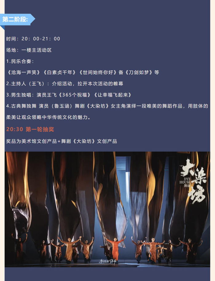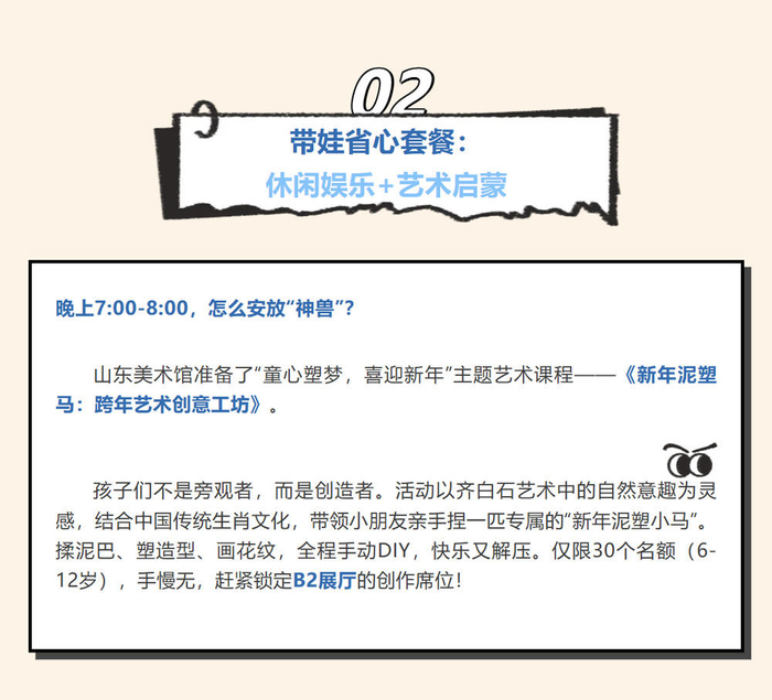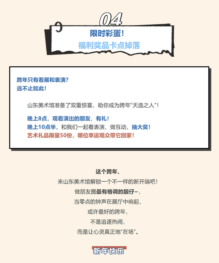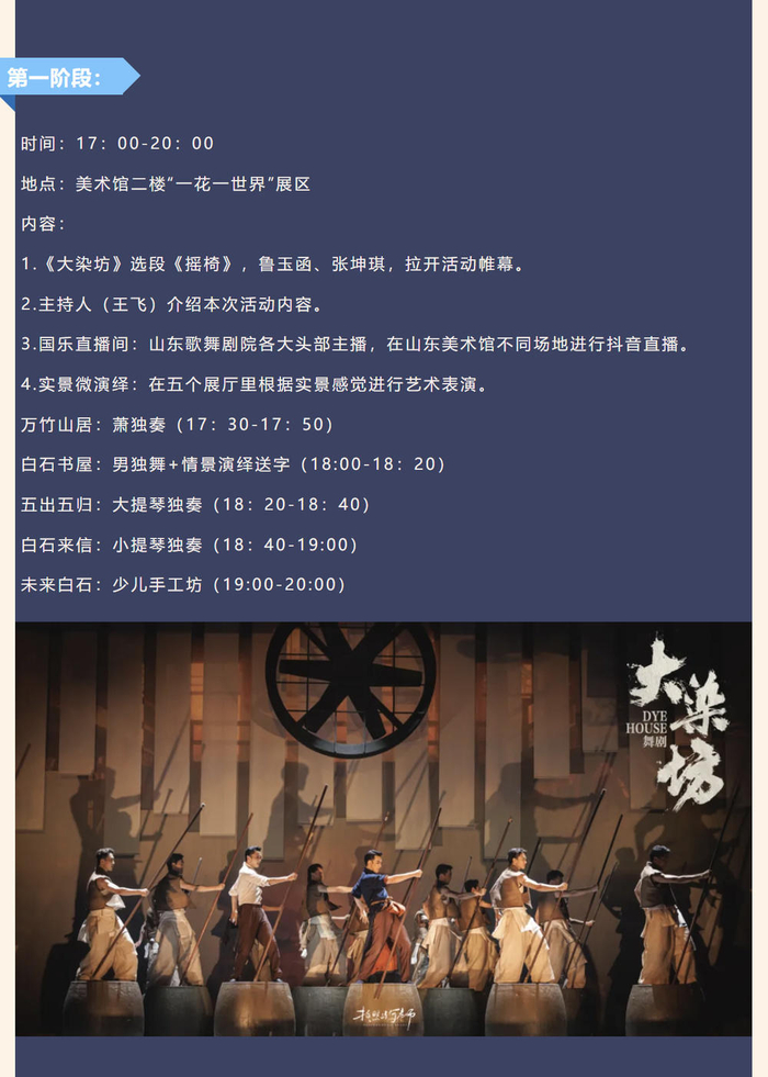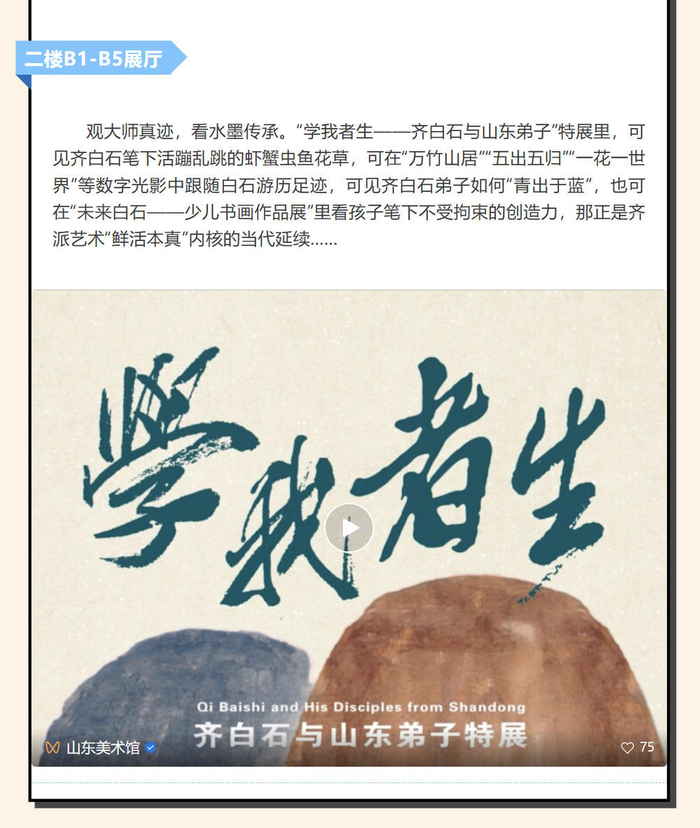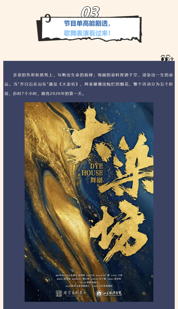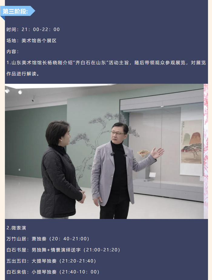 山东美术馆首次组织跨年活动,和山东歌舞剧院强强联合,诚意满满。136件齐白石和弟子的原作珍品,《大染坊》原创班底,“画是静态舞,舞是动态画”,产生1+1大于100的艺术魅力。加上山东歌舞剧院强大的主播团队,各种穿插在展厅里的演出和展览单元产生的艺术涟漪。