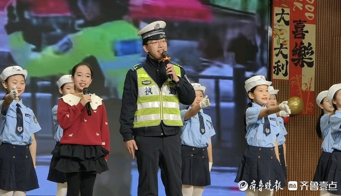 当联欢会的温馨氛围达到高潮时,轻舞飞扬舞蹈团的《新春护行》带来了特别的惊喜。一位身着制服的交警登台演唱,与小小舞者们亲切互动,一起比划着交通安全手势,场面温馨,生动诠释了“护航成长”的深刻含义。