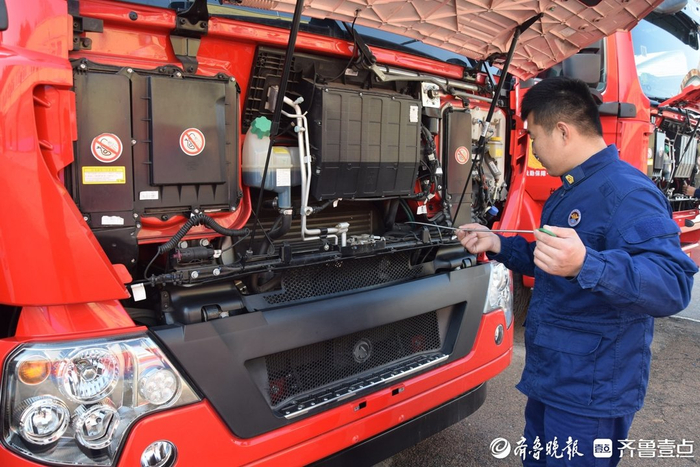 青岛支队未雨绸缪,系统开展装备车辆“体检”。在车间内,消防员对发动机、制动系统、供暖装置等关键部位逐项检测调试。
