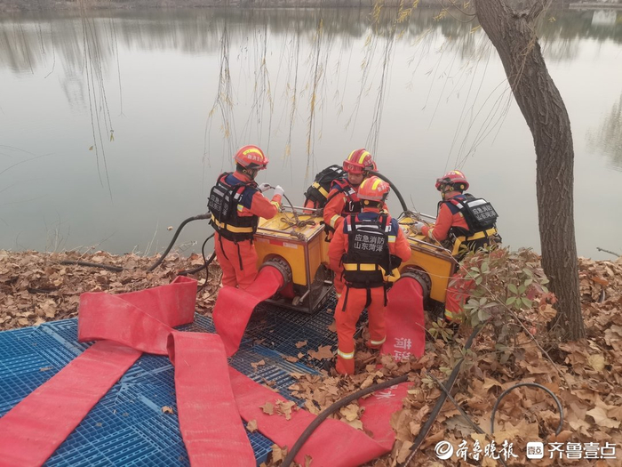 近日,在菏泽市玉皇化工厂的消防水池旁,消防员们呵着白气,将浮艇泵缓缓沉入刺骨的水中。