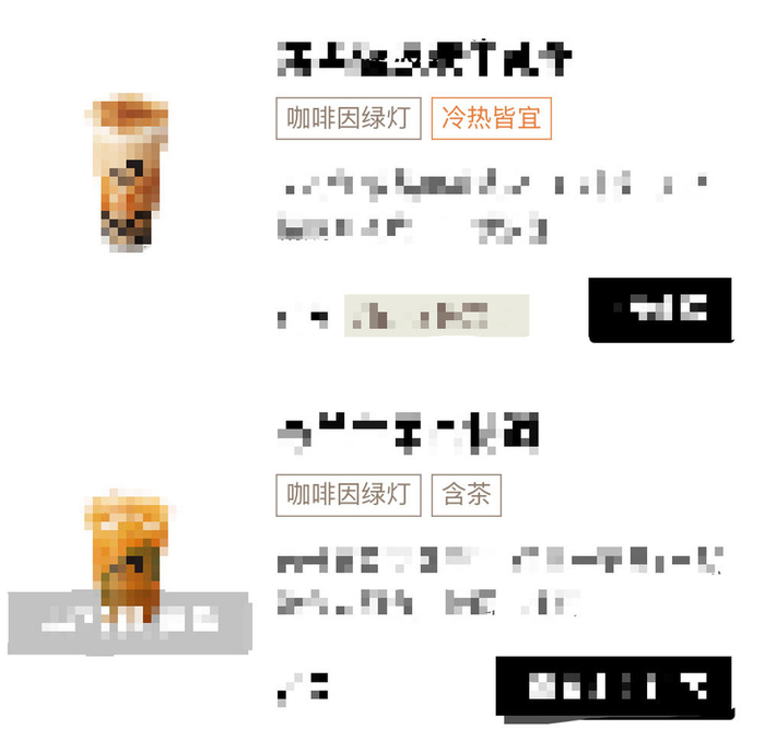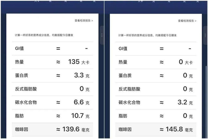 某茶饮品牌部分茶饮产品中的咖啡因含量(左图为一款原叶奶茶,右图为一款原叶果茶)至于同等体积的一杯拿铁咖啡,咖啡因含量在100毫克左右;美式咖啡的咖啡因更多一点,约150毫克。