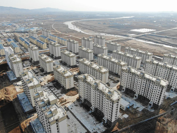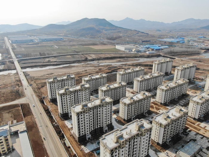 蒙河双堠水库3号安置区与蒙河双堠水库移民就业产业园隔河相望(12月31日拍摄,无人机照片)。蒙河双堠水库工程在建设过程中,将产业安置作为移民生产安置的重要举措,同步配套建设移民就业产业园区,解决移民就业问题,目前13家企业已签约入园,其中3家已投产运营。