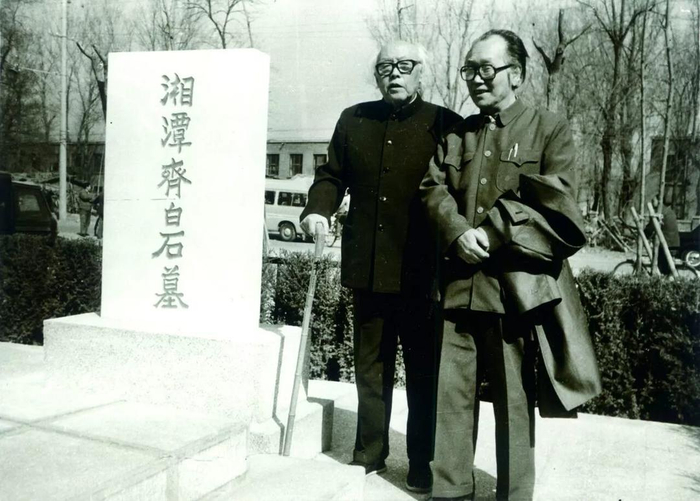 1982年清明,李苦禅与许麟庐在齐白石墓碑前。齐白石是我国现当代大写意花鸟画的一代宗师,一生热心栽培、奖掖后学,人称“弟子三千”,他曾自刻“三千门客赵吴无”印,意谓自己的门人弟子数量远超赵之谦和吴昌硕。其中,李苦禅是齐白石最为器重的山东籍弟子,不仅精于技,而且重于道,为传承和发展齐派书画艺术作出了卓越贡献。