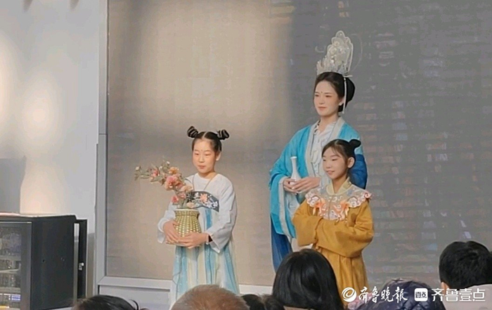 舞狮展演结束后,来自山东女子学院明镜台汉服社的大学生们化身为“非遗导赏员”,引领广大市民开启一场别开生面的游园之旅。从一楼大厅的非遗市集,到负一层的体验区、专题展厅,他们衣袂飘飘、步履从容,将非遗及其承载的历史文化故事娓娓道来。静态的非遗展品、动态的技艺展示,因他们的生动讲述变得鲜活可感。