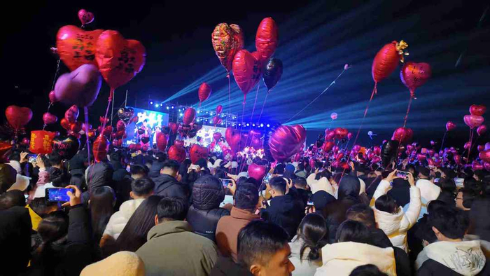 2025年12月31日晚在沙滩区域举行的跨年音浪狂欢会,现场热浪涌动,游人越聚越多。周围的酒吧、简餐、咖啡厅、特色餐吧……游人如潮水一般,不知道翻了多少次台。23:59,倒计时开始,随着2026年新年到来,在现场翘首以待的众人一齐将手中心形气球抛向空中。一场十几分钟的盛大焰火表演随后拉开。此时,聚集在蒙山脚下的万人如痴如醉,每个人都被跨年的喜悦所陶醉。