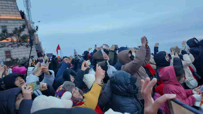 在凛冽的山顶寒意中,游客热情始终高涨。景区精心准备了纳福、降福礼、与财神NPC趣味互动、寄语和放飞等活动,依次进行。众人心中的期待感也不断堆积。7:30许,2026新年的第一缕阳光终于在众人的期待下降临,光芒瞬间洒满龟蒙顶。大家沉浸其中,被山川变幻的景象所震撼。