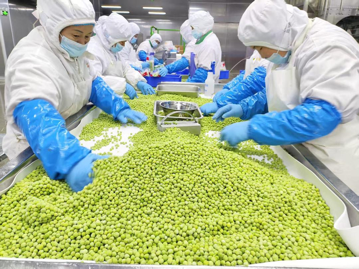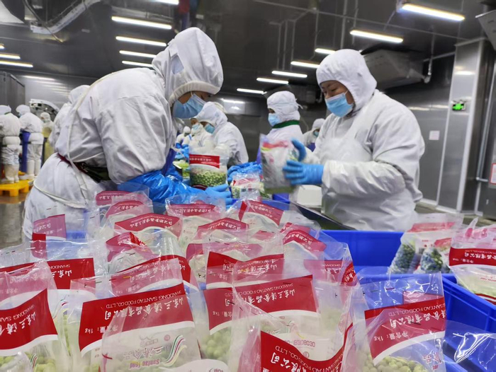 同样,在山东潍坊安丘,另一家出口骨干企业——山东三涛食品有限公司也同步发出了“新年第一柜”。公司专注肉类和蔬菜深加工,产品主打欧美市场。今天的货柜装的是刚从生产线下线的20吨毛豆,即将发往美国。