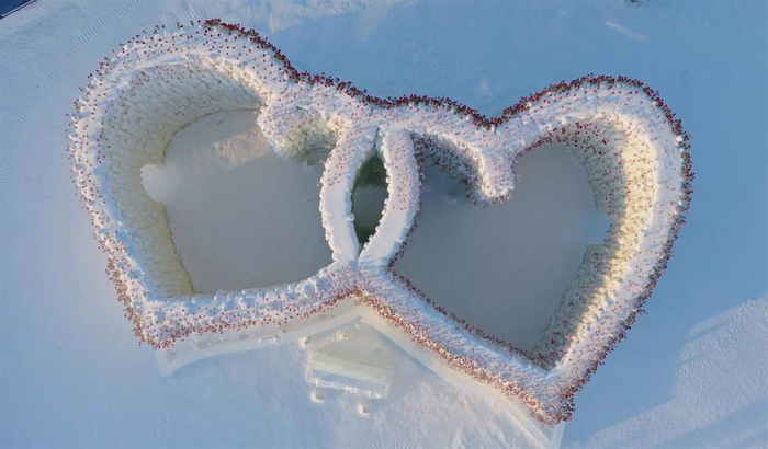冰瀑玫瑰的航拍视角航拍视角显示,一排排的红玫瑰点缀在两个爱心形状的冰雕上,仿佛从冰墙上长出一般。据了解,该冰雕建筑于2025年底刚刚建成,位于园区西区冰雪大舞台旁边。