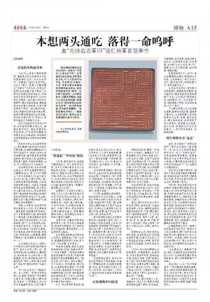 诸城博物馆藏有宋金元时期的一枚铜印,印面为“元帅右监军印”,经考证系山东红袄起义军遗存的文物,印主人推为首领李全。李全潍州(今潍坊)人氏,在宋金蒙关系最微妙的时代起兵抗金,故南宋朝没有视他“流寇”,反倒赋予其统领一方的朝廷命官;后蒙古军崛起,他在山东益都受困投降,被蒙古任为“都元帅行山东路尚书省事”,该印算是物证。因为他反复横跳,一面领着南宋的粮饷,一面谋划攻打南宋,最终自食其果遭到覆灭而惹人耻笑。