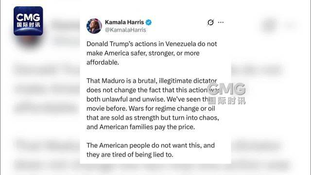 哈里斯指出,美国对委内瑞拉采取军事行动是“错误且不明智的”。她强调,这种做法既不合法,也不会让美国“更安全、更强大或让美国人民的生活更可负担”。