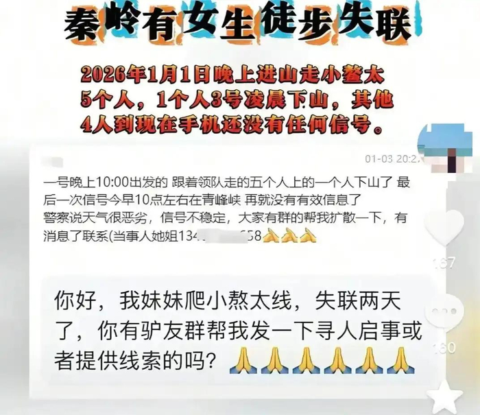 近日,有网友在社交平台发布一则寻人启事,称自己妹妹在2026年1月1日晚上出发,跟着领队一共5人进山走“小鳌太线”后失联至今。网帖介绍称,5人中有1人在3日凌晨下山,其他4人还未发现手机信号。4日下午2时30分许,红星新闻记者致电陕西省公安厅森林公园局第二分局,一名接线人员表示:“还在搜救当中。”