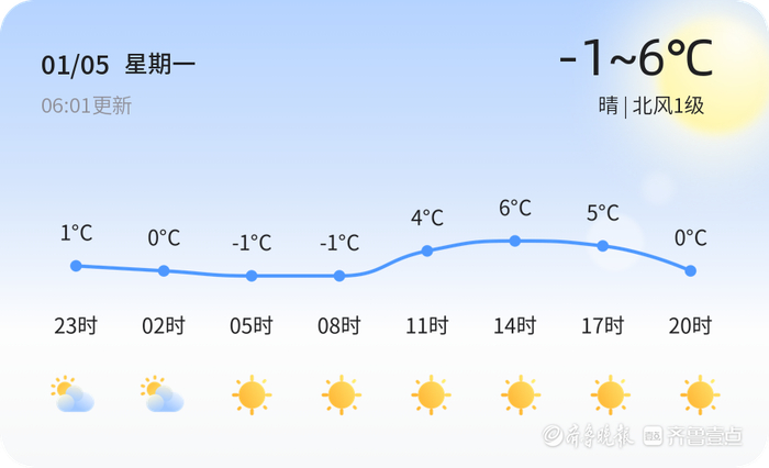 今天是2026年1月5日,星期一,农历十一月十七。枣庄市迎来小寒节气,今日天气晴朗,北风1级,气温在-1℃至6℃之间。小寒是二十四节气中的第23个节气,标志着一年中最寒冷的时节正式开始。此时节,市民应注意保暖,避免感冒,同时注意饮食调理,适当增加温热食物的摄入。各区天气情况总体平稳,均为晴天,气温略有差异,但整体适宜出行。明天枣庄天气晴好,气温与今日持平,最低气温-1℃,最高气温7℃,风向转为东风,风力仍为温馨提示