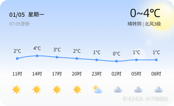 今天是2026年1月5日,星期一,农历十一月十七,我们迎来了二十四节气中的小寒。今日青岛天气晴转阴,气温在0℃至4℃之间,北风3级,空气湿度为69%。PM2.5指数为143,空气质量为中度污染,建议敏感人群减少户外活动。今日天气对市民出行影响不大,但早晚温差较大,市民需注意保暖,适时增添衣物。