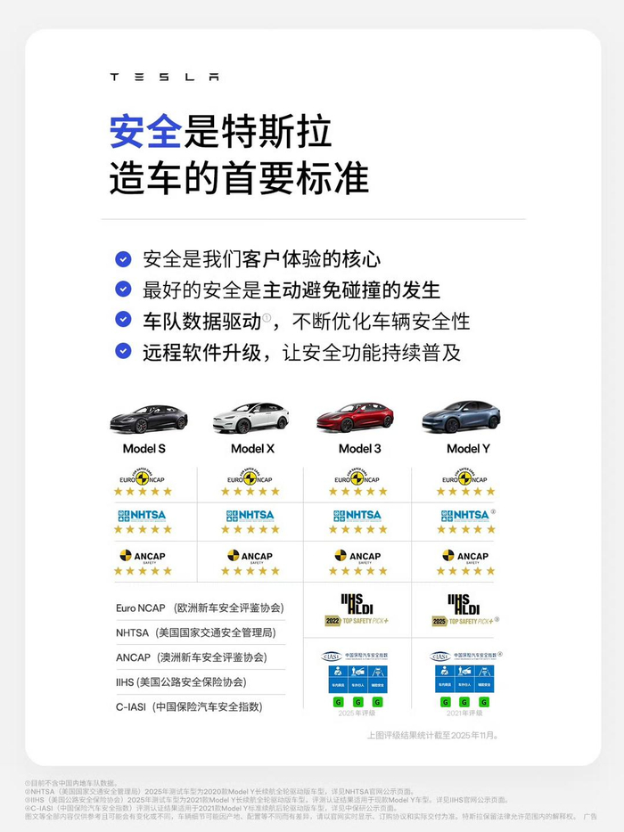 2025年,现款Model Y 斩获2025年Euro NCAP(欧洲新车安全评鉴协会)、ANCAP(澳洲新车安全评鉴协会)“五星安全”评级。作为全球车型,S3XY全系车型满足全球多个市场的严苛标准,已在美国NHTSA、欧洲Euro NCAP、中国C-IASI、澳大利亚ANCAP等多个权威机构中获得“五星安全”评级。