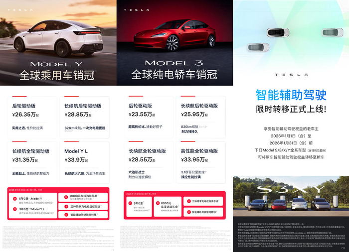日前,特斯拉更新了2026年1月的多重购车政策:1月31日前下单Model 3/Y,可享“5年0息”、8000元车漆选装礼金、1299元特享充电权益,以及“智能辅助驾驶限时免费转移”等多重福利,助力消费者购车。