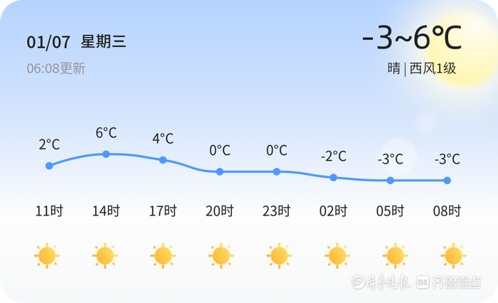 今天是1月7日,农历十一月十九,菏泽市迎来晴朗天气。今日气温较为舒适,最高气温可达6℃,最低气温为-3℃,目前实时气温为-1.9℃。全市各区天气情况一致,均为晴朗,西风1级,空气湿度66%,PM2.5指数为47,空气质量良好。市民朋友们可以放心享受冬日的阳光。