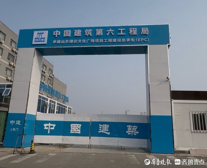 1月6日,记者实地探访济南市历城区的山东德云文化广场项目现场发现,施工主入口的标识牌匾已完成更换,新牌匾清晰标注“中国建筑第六工程局承建山东德云文化广场项目工程建设总承包(EPC)”,取代了原先仅标注项目名称的旧牌匾。
