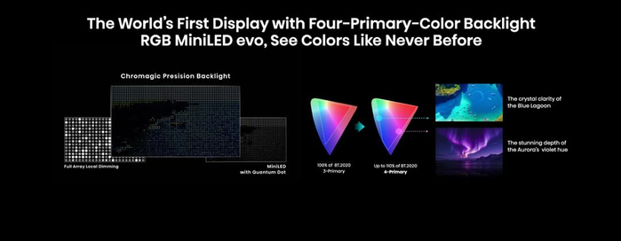 1月6日,海信正式发布全新一代RGB-Mini LED技术,此技术的一大核心看点在于其自主研发的“玲珑4芯真彩背光”。海信在RGB三色架构的基础上,增加了第四种“天青色”自发光芯片。