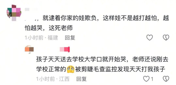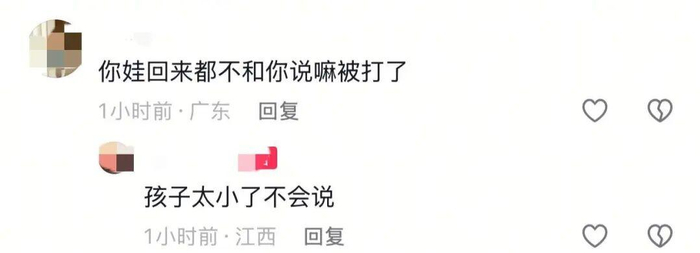 记者尝试私信联系发布视频的网友,截至发稿未获回复。在视频评论区,有网友问及“孩子回家后没有告诉你被打了吗”,该网友回复称:“孩子年龄太小,还不会表达。”。该网友还补充说道:“每次送孩子到校门口他就哭,老师却说刚上学哭闹是正常的。直到后来孩子被剪睫毛,自己去查监控,才发现孩子天天被打”。