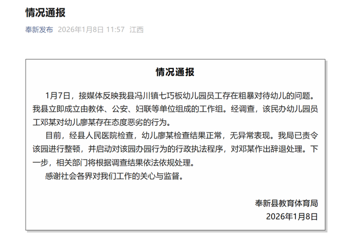 1月8日,江西宜春市奉新县教育体育局发布情况通报: